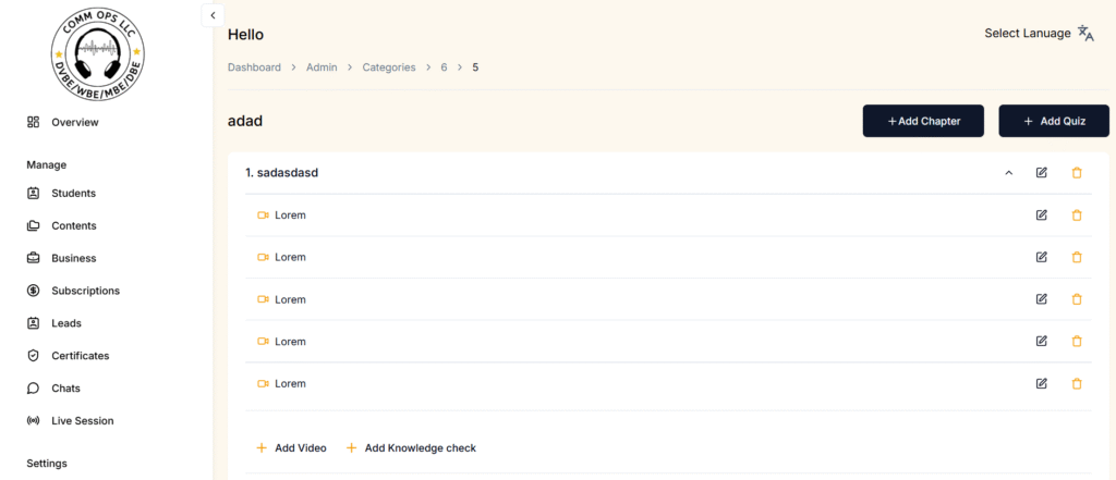 The system also includes an integrated chat feature that allows administrators to communicate directly with students and business users. This improves user engagement, provides support when needed, and strengthens the connection between educators and learners.