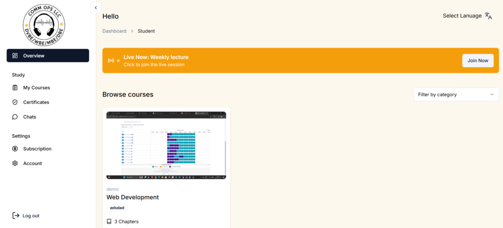 The LMS automatically tracks each learner’s progress throughout the course. Once a student successfully completes the required modules and assessments, the platform generates a digital certificate, helping learners validate their achievements and professional development.
