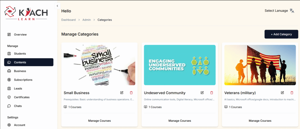 Organizations can purchase customized training packages for their teams. Businesses can access specific course categories and allocate learning seats to their employees, based on the agreed plan with the administrator.