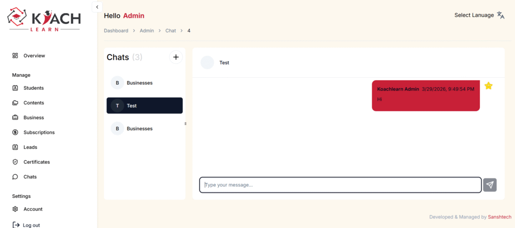 To ensure continuous support and interaction, the platform includes a built-in chat system that allows administrators to communicate directly with students and business users. This feature improves engagement, enables quick issue resolution, and strengthens the overall learning experience